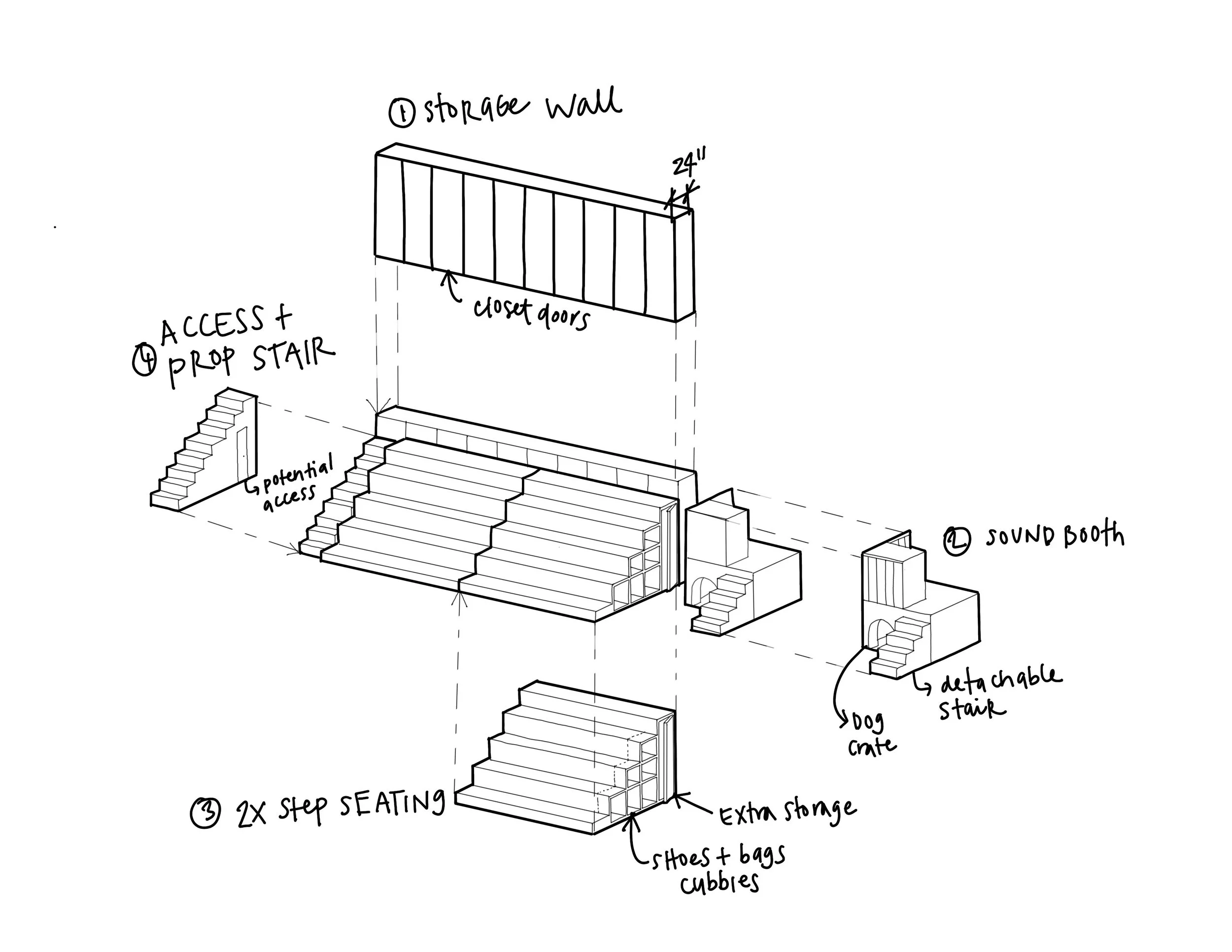 3am Theatre is a collaborative performing arts, and rehearsal space in a former factory in Astoria, Queens. A+A+A worked closely with the clients to re-use salvaged stage furniture to create a flexible system that serves varied programming dedicated to exploring, incubating, and presenting works of circus, physical theater, modern dance, and experimental music.